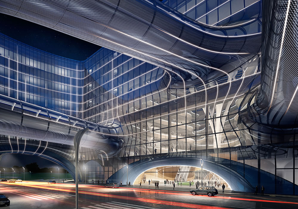 Изюминкой проекта стало решение с центральной автомобильной магистралью «Сколково» — дорога не огибает комплекс, а буквально пронзает его, разделяя здание на две части. Офисные помещения, где будут работать IT-специалисты, расположатся прямо над оживлённой трассой.