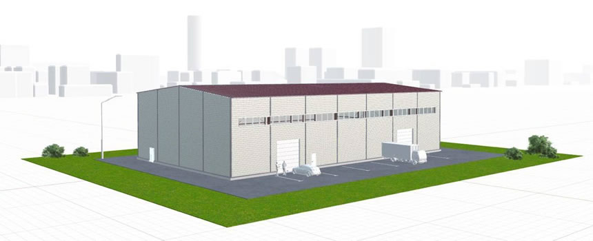 Серийное здание 24 × 42 × 8,5 м идеально подходит для склада, производства или логистического центра.