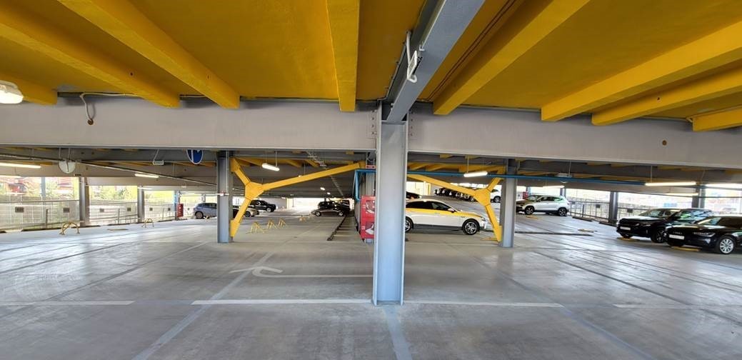 Девятиэтажный паркинг ЖК «Бунинские луга» в Новой Москве от компании «Ферро-Строй» внешне отсылает к архитектуре брутализма, а внутри представляет собой свёрнутое пространство. Движение ведётся по винту с помощью наклонных перекрытий, без рамп. Первая очередь уже введена в эксплуатацию. Здание построено с применением большепролётных конструкций на основе металлокаркаса.