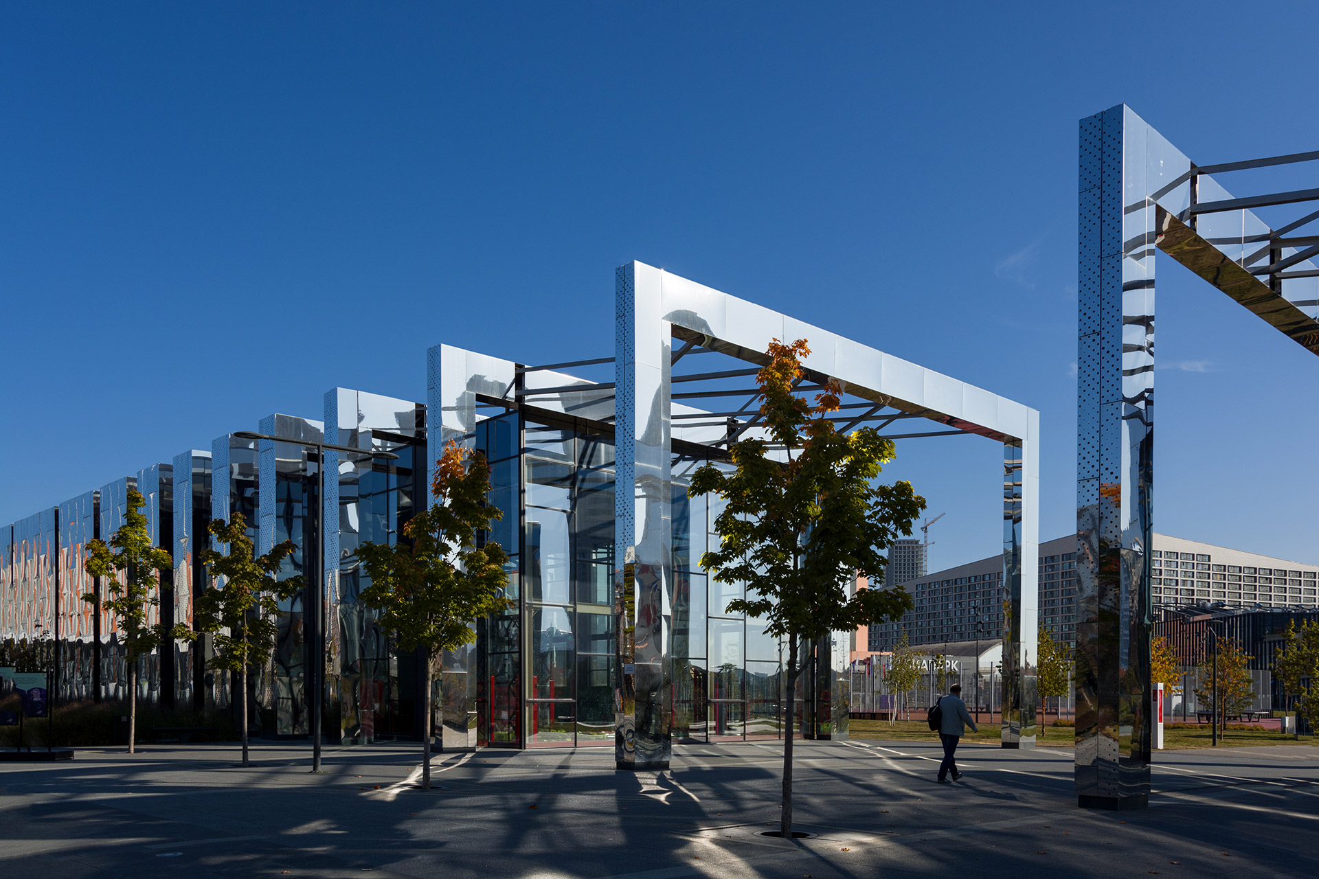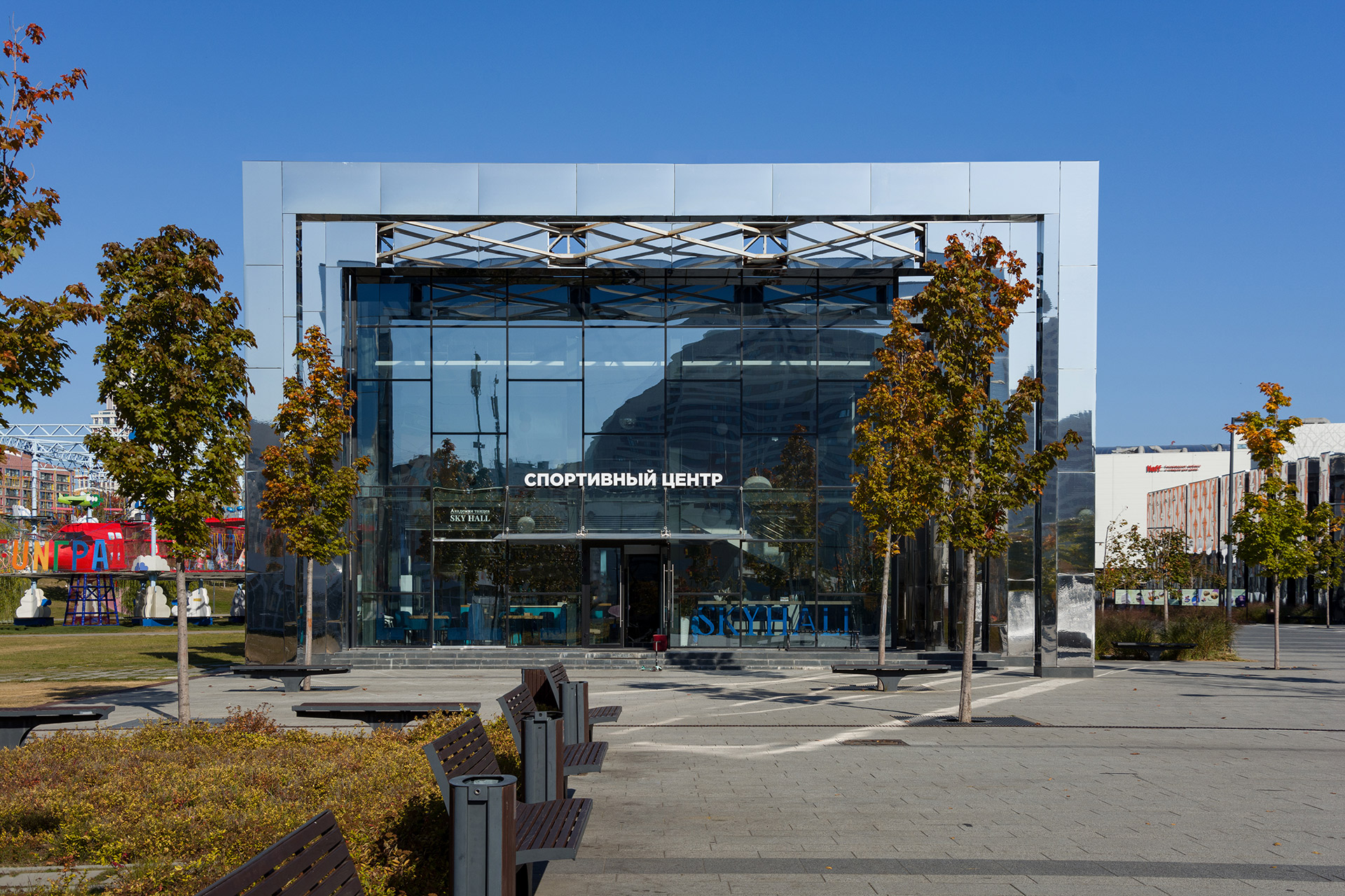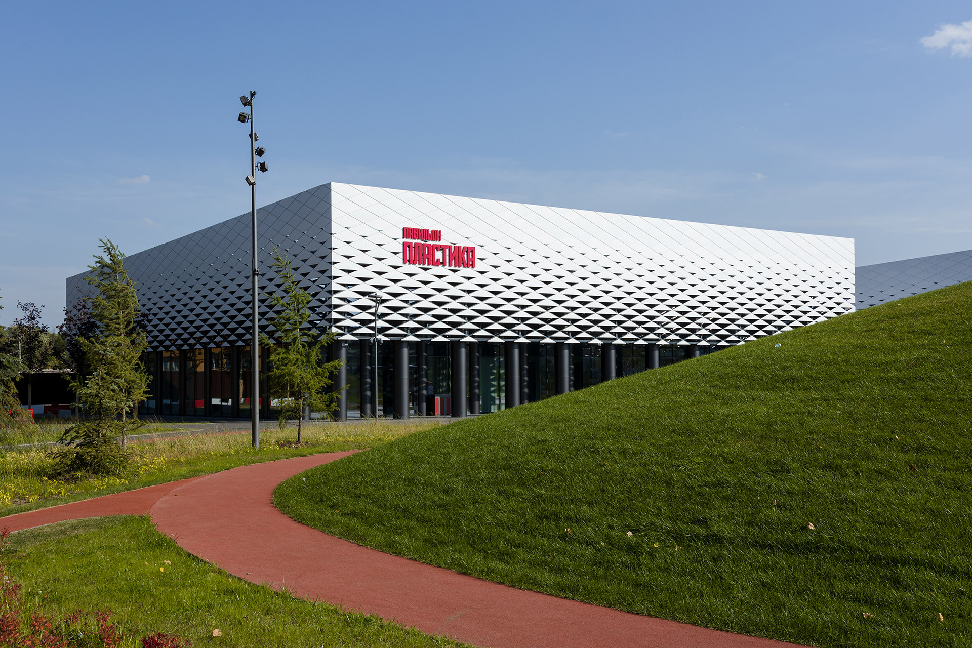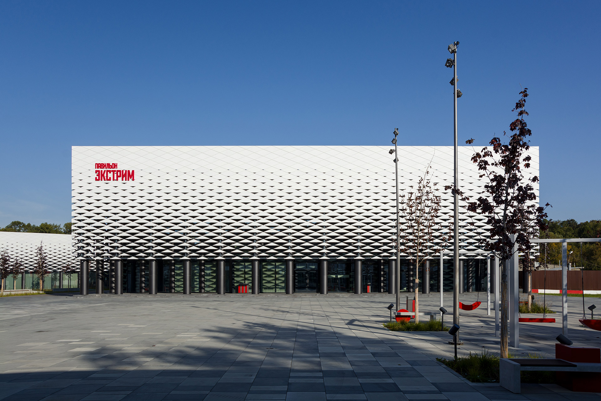 Помимо многофункциональных павильонов, здесь есть большой крытый манеж со скейт-парком. Фасады всех объёмов выполнены из белых матовых металлокассет на ромбовидной подсистеме, параметрически изменяющихся по вертикали.