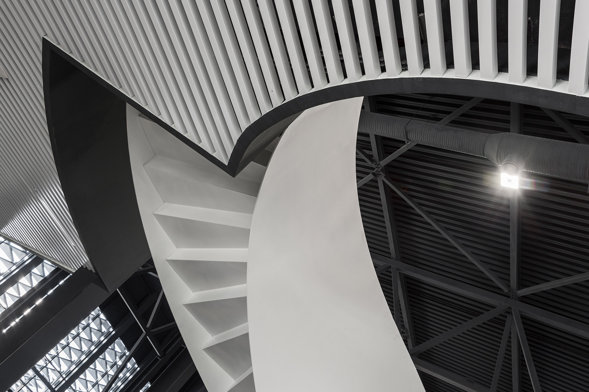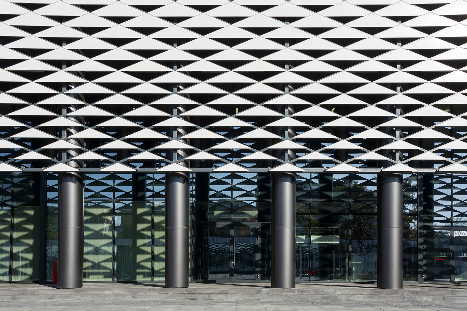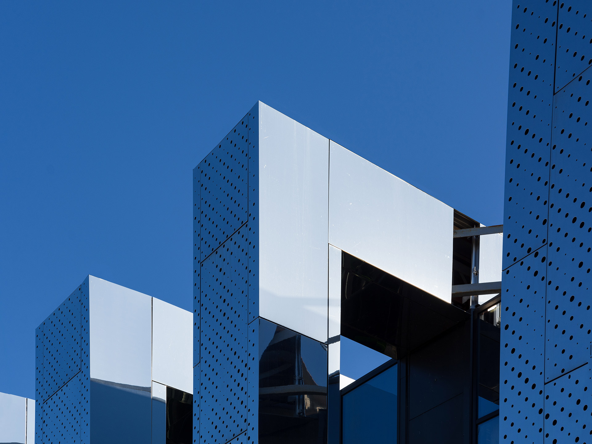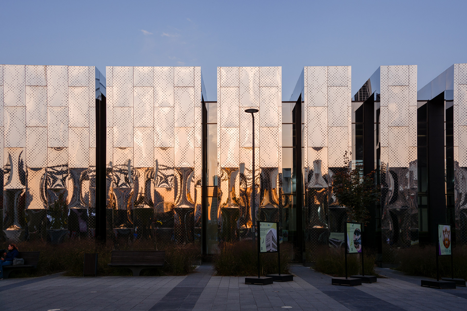 Помимо многофункциональных павильонов, здесь есть большой крытый манеж со скейт-парком. Фасады всех объёмов выполнены из белых матовых металлокассет на ромбовидной подсистеме, параметрически изменяющихся по вертикали.