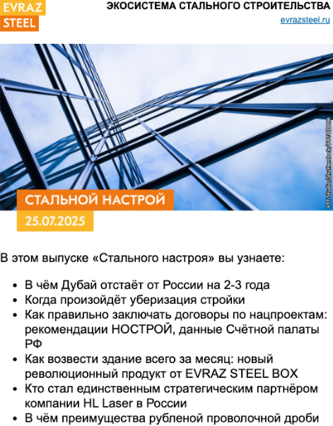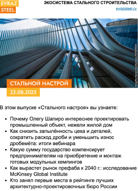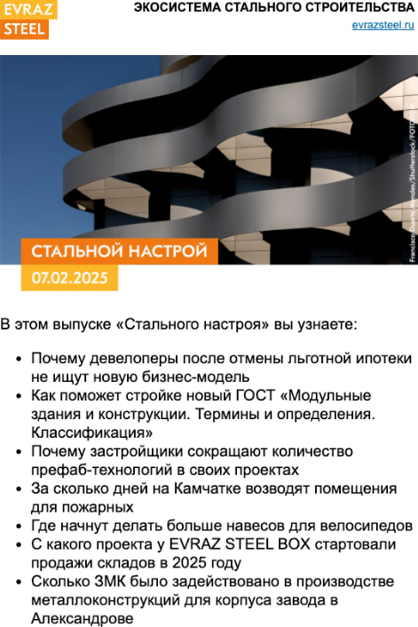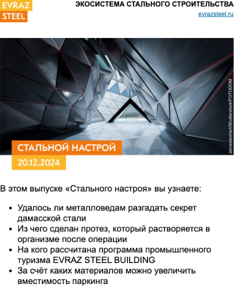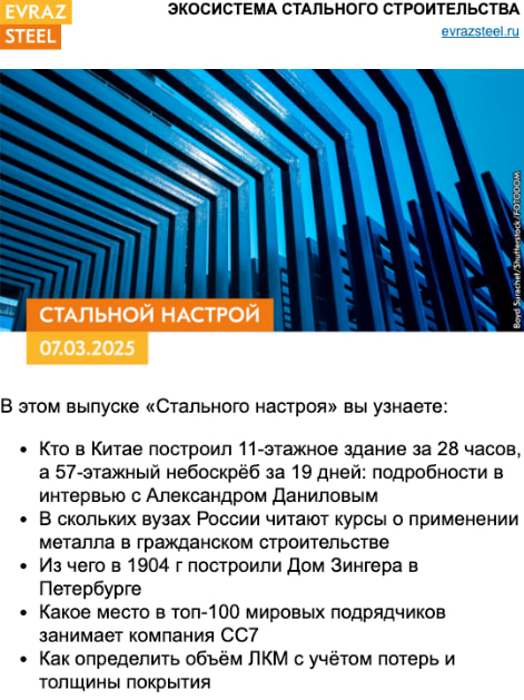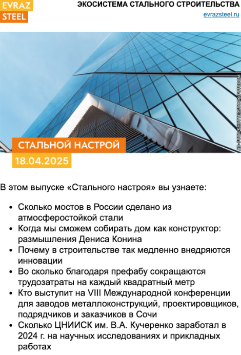 В активной базе рассылки EVRAZ STEEL уже более 2000 подписчиков: директоров заводов металлоконструкций, проектировщиков, строителей, генподрядчиков, преподавателей и студентов профильных вузов, а также тех, кому интересно развитие отрасли стального строительства.